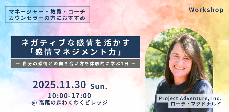 講師には、米国 Project Adventure, Inc. よりシニアコンサルタントのローラ・マクドナルド(Laura MacDonald)氏 を迎え、体験を通して感情と行動のつながりを探求します。